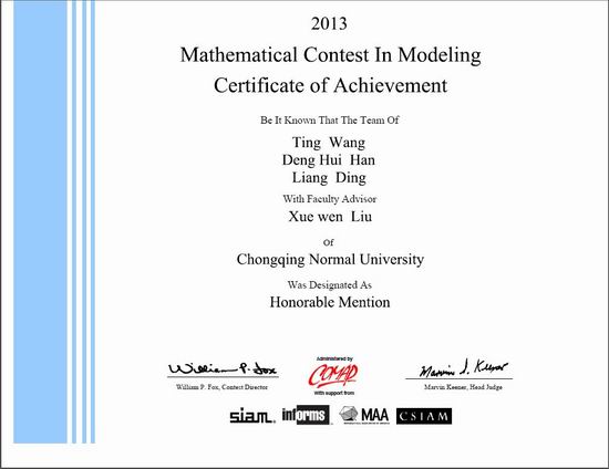 2010级信息管理与信息系统专业韩登辉、丁亮与数学学院2010级学生谢家慕妍、舒巧媛、李春燕、王婷、朱闪闪、张丹、张超等同学在数学学院赵克全、刘学文老师的指导下,摘得两个二等奖(Honorable Mention)、一个三等奖。其中,比思论坛
