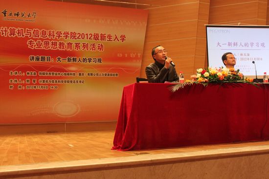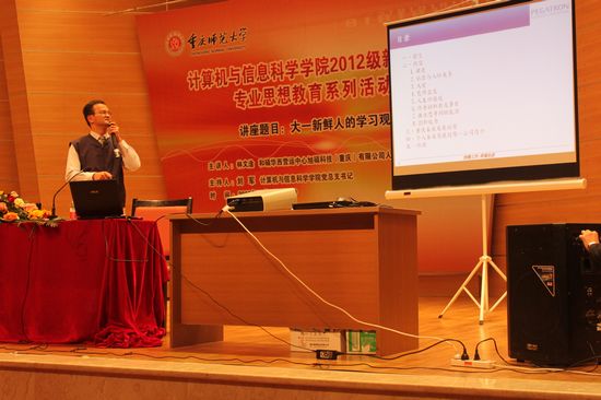 为使新生对四年生活有明确规划,对未来职业发展有明确目标。比思论坛 邀请到旭硕科技(重庆)有限公司人力资源部经理林文淦,于2012年11月8日下午在校友会堂音乐厅为2012级全体新生开展了“大一新鲜人的学习观”主题讲座。院全体学工队伍老师参与,大会由学院党总支书记刘军主持。