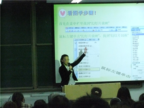 比赛分为教案设计、模拟授课、即兴演讲、现场提问四个环节,教案提前交给了评委老师。首先,六位“小老师”依次登台,围绕“因特网信息查找”、“c程序设计语言”、“使用PPT过程中的技巧问题”、“excel的使用”及“flash的认识”等相关内容展开模拟授课,用各自的方式在台上展示教姿、教态。即兴演讲环节,1号的沉着稳定、2号的从容自然、3号的游刃有余、4号的趣味连连、5号的新异导入、6号的和蔼亲切,无一不给人留下深刻的印象。在现场嘉宾提问环节中,台上选手灵活应答,赢得台下掌声不断。随后,郑志华老师对各位选手做出了精彩点评,她在肯定人人都有亮点的同时,也指明每位选手的不足并给予建议。经过严谨的计分统分,唐万梅老师宣布比赛结果,王雪梅、王露两名同学分获第一、第二名。在选手与嘉宾的合影中,此次大赛圆满落幕。