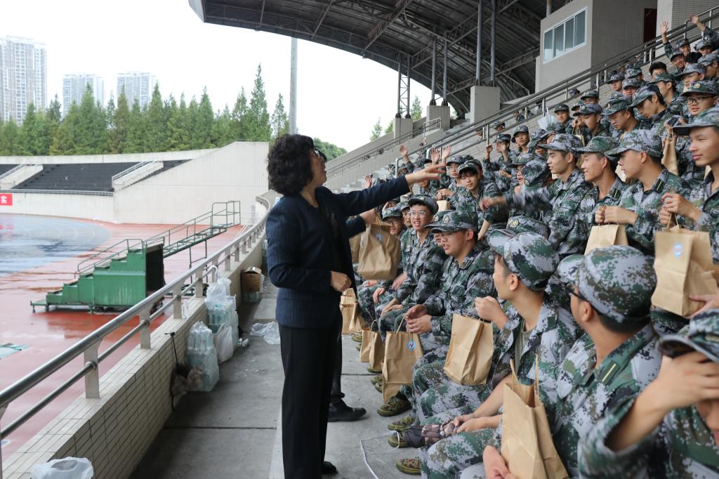 党委书记陈兰、院长魏延、党委副书记何东、副院长李世宏、团委书记钟华与新生指导员刘宇、梁耀文、项铸为认真训练的新生们送去温暖慰问。