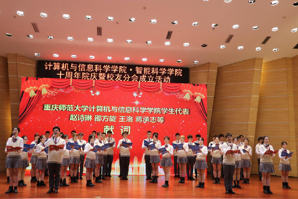 接下来,学生代表上台献词,计信学子声情并茂地表达了学院的深情与祝愿,博得台下阵阵掌声。紧接着,2012级计算机科学与技术专业学生刘玉立作为毕业生代表表达了对学院领导老师悉心培育的感激之情以及对学院未来发展的美好憧憬。重庆计算机学会秘书长曾一教授、南京师范大学计算机与电子信息学院院长吉根林教授、腾讯教育高校产品总经理钱栩磊先生上台致辞,表达了对计信学院十年生日的祝福,并表示将加深校企合作,助推学院发展。同时,比思论坛