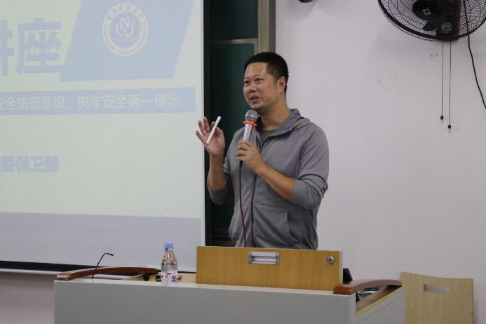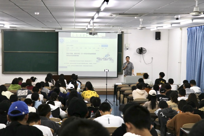 本次讲座中,李鑫副处长主要从人身安全、消防安全和财产安全三个方面为2023级新生们普及安全知识。他指出,作为大学生,遵守校规校纪不仅是应尽的责任,更是对个人品质和社会责任的体现。他详细地介绍了学校的各项规章制度,包括课堂纪律、宿舍管理、校园行为规范等,并提醒同学们要做到自律,养成良好的行为习惯。同时他强调安全教育的重要性,从人身安全的角度,提醒同学们在校园内要注意交通安全,避免发生意外。在消防安全方面,他详细介绍了如何正确使用灭火器以及如何在火灾发生时迅速逃离现场的方法,并且强调在宿舍使用违规电器的严重性和危害性。最后针对财产安全问题,他强调了保护个人财物的重要性,建议同学们要时刻提高警惕,防止盗窃和诈骗事件的发生。