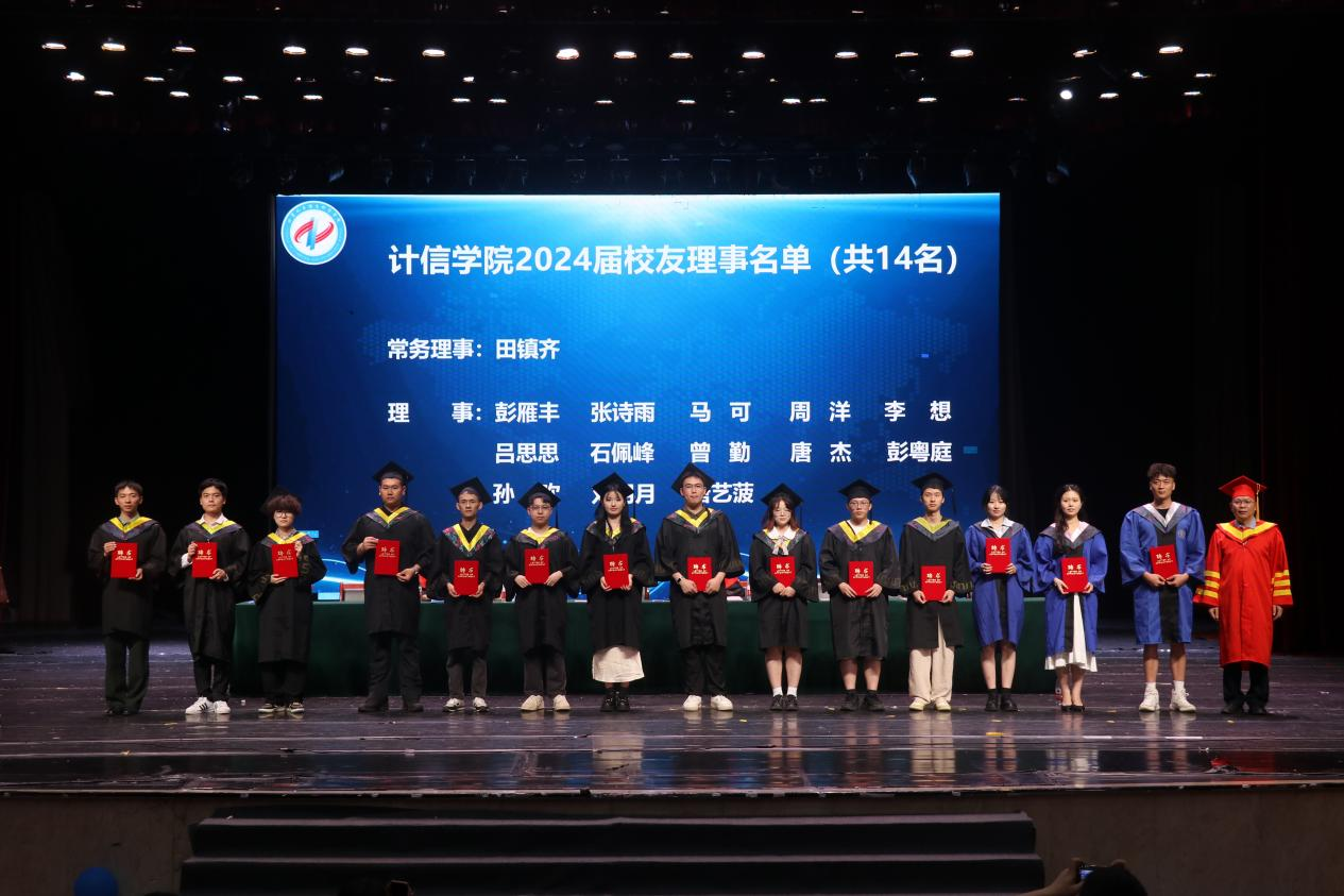 随后,学院校友分会会长魏延宣读校友理事名单并颁发聘书。魏延院长为毕业生们送上临别寄语。他祝贺同学们顺利毕业,开启人生新阶段;感谢同学们,与学院同进步共成长;鼓励同学们弘扬计信精神,转变角色继续进步,用好计算机这把钥匙打开人生新篇章,坚持终身学习,勇于担当社会责任。