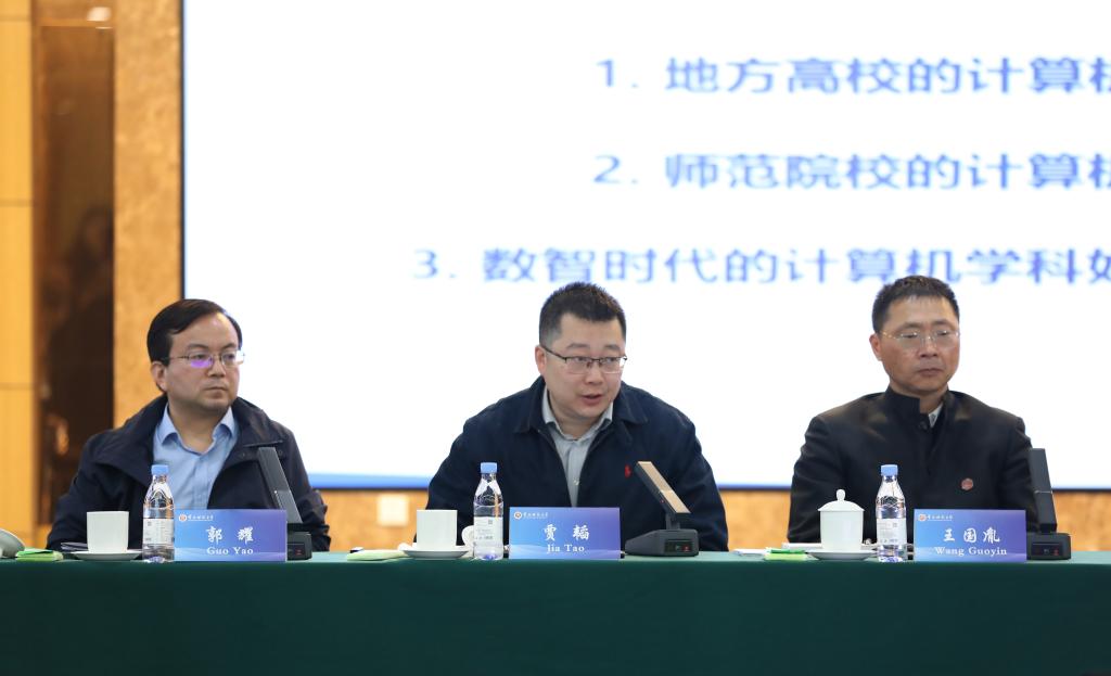 王国胤校长首先致欢迎辞,他介绍了学校“立德树人”根本任务落实情况,他强调指出,学校目前正构建师范教育与非师范教育协同发展的办学格局,强调学校正积极推动人工智能、大数据等前沿技术与师范教育深度融合。王国胤校长指出,计算机学科“101计划”是推动本科教育教学改革的重要抓手,学校将依托数字化教师教育高等研究院,探索“图灵班”等地方特色人才培养模式,全面提升人才培养质量。