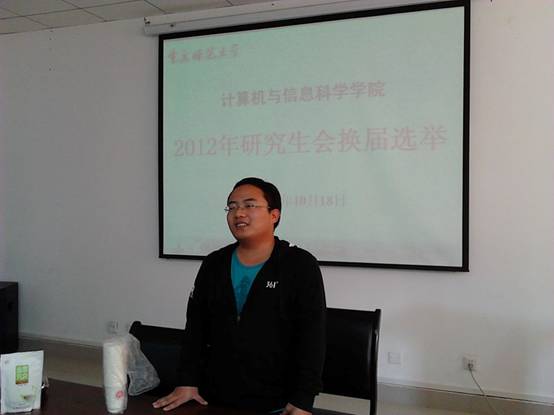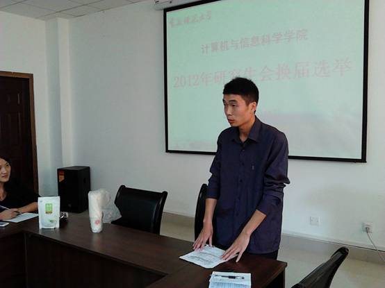 2012年度研究生会换届选举大会在集贤楼233会议室召开。学院研究生秘书李明勇老师以及10、11和12级研究生出席了此次大会,大会由研究生会学术部部长冉燕辉主持。