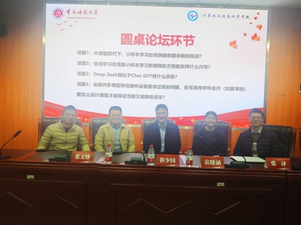在圆桌论坛环节,结合会前征集的学生感兴趣的议题,主讲人与三位嘉宾就“大模型时代下,小样本学习如何突破数据依赖的瓶颈?”、“生成学习在克服小样本学习数据稀缺方面能发挥什么作用?”等4个议题内容展开讨论。