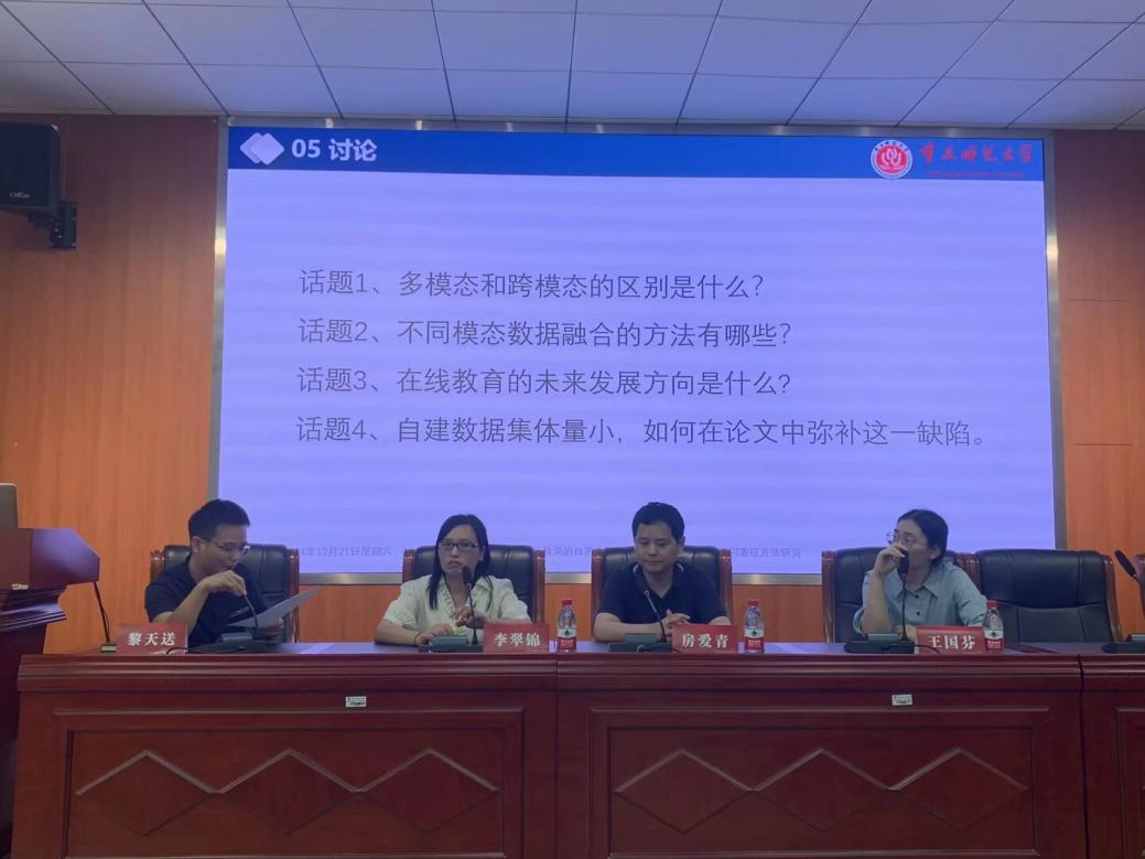 在圆桌论坛环节,结合会前征集的学生感兴趣的议题,主讲人与三位嘉宾就“多模态和跨模态的区别是什么?”、“不同模态数据融合的方法有哪些?”和“自建数据集体量小,如何在论文中弥补这一缺陷”等4个议题内容展开讨论。