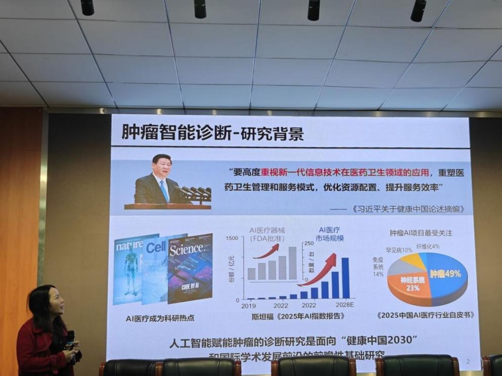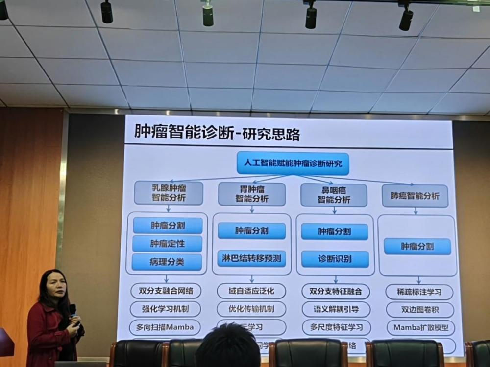随后,雷柏英教授首先对科研室的主要研究方向与工作内容进行了介绍,其中重点介绍了医学图像处理和人工智能在肿瘤诊断领域的相关研究成果和最新进展,报告主要涵盖以下方面:针对乳腺癌的多临床流程智能分析;基于多中心CT影像的胃癌对应分析;鼻咽癌的早期诊断与预防策略;以及肺癌CT影像的智能分割模型。最后,雷柏英教授进一步展望了人工智能技术在肿瘤精准诊疗应用方面的未来趋势与挑战。