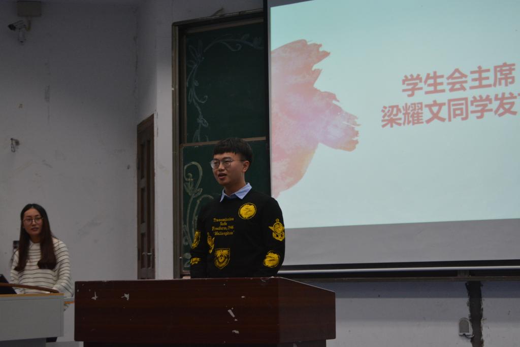 大会开始,钟华老师首先对新加入的一百二十名同学表示热烈欢迎,同时向第九届团学会的全体成员传达了她对大家的期待与厚望,并肯定了大家在这段时间的付出。而后,计信学院第九届团学会主席梁耀文就本次成立大会发表了自己的感想。这已经是他在团学会工作的第三年,他把团学会当成一个大家庭,每一位成员都是自己的家人。深情的语言感染着在场的每一个人。