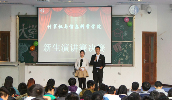2014年11月27日15时许,以“迈好大学第一步,走好成功人生路”为主题的新生演讲决赛在弘德楼5105隆重举行。本次比赛由14级计科1班班长和14级信管班长担任主持人。到场的评委及嘉宾有计信学院党委副书记杨宇,13级辅导员朱嘉洁老师,以及第六届学生会书记张聪杰、主席刘玉立、办公室主任彭翰迪、生活部部长徐政等。