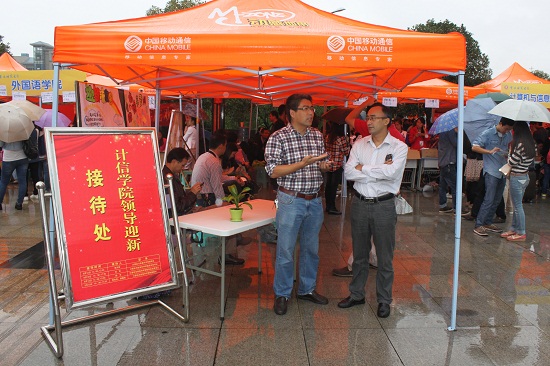党总支书记刘军、院长李月臣、副院长李世宏、杨德刚,党总支副书记杨宇、办公室主任罗世祥亲临迎新大本营现场,其中主要党政领导实行“领导迎新接待制”,制作的有“计信学院领导迎新接待处”迎宾牌,坐镇迎新现场解答新生及家长的疑问,受校领导班子的一致好评。