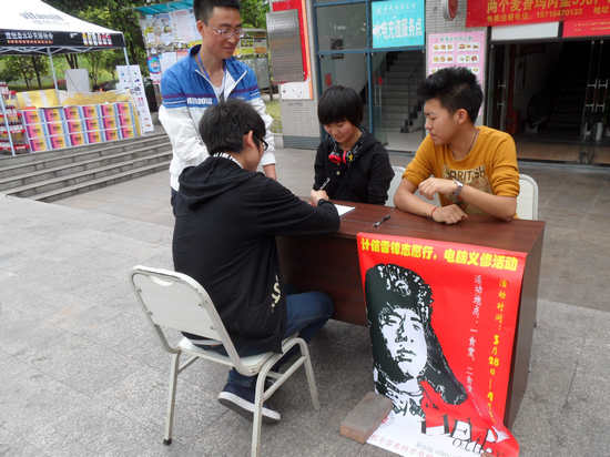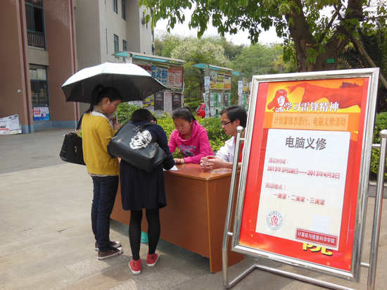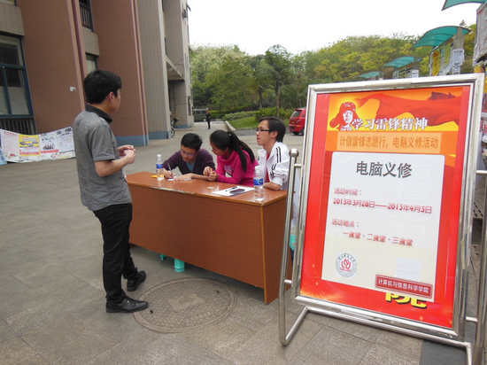 团总支学生会各部门协调合作共同举办了以“书写我的雷锋日记”为主题的电脑义修活动。通过专业与奉献相结合,为全校师生服务。活动于2013年3月28日下午2:00,在我校各个食堂火热开展。据悉,活动周期为一周,此次活动由比思论坛