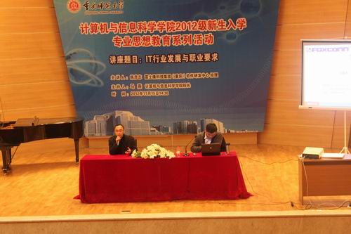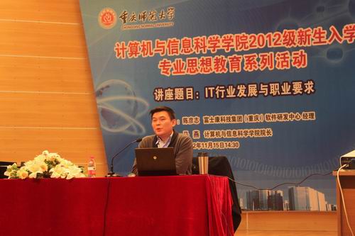 为使新生明确学习目标,了解IT行业的职业要求,提高同学们自我学习的意识并做到有规划的学习。比思论坛 于2012年11月15日下午在校友会堂音乐厅隆重邀请到了重庆富士康科技集团软件研发中心经理陈彦志先生为2012级全体新生开展了“IT行业发展与职业要求”主题讲座。比思论坛 马燕院长和刘军书记出席,全体辅导员老师参会。