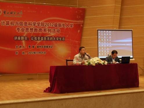 2012年11月25日晚7:30在校友会堂音乐厅,学院邀请到我校原数计学院计算机专业毕业的优秀校友——渝中区团区委书记罗毅为2012级全体新生开展了“让我受益匪浅的大学生活”的主题报告会。比思论坛