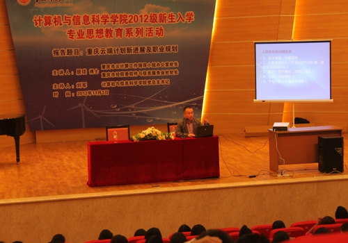 邀请到重庆市云计算工作领导小组办公室处长、重庆市经信委软件与信息服务业处处长居琰博士,于2012年11月1日下午2:30在校友会堂音乐厅为2012级全体新生开展了“重庆云端计划新发展及职业规划”的主题报告。院学工办和2012级辅导员参与报告大会,报告会由学院党总支刘军书记主持。