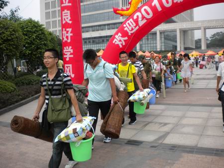 新生接到大本营,将其家长带到休息处,为其送水和扇子,让他们静心等待新生报到完毕归来。然后顶着烈日陪同新生走完所有的报到程序,并帮助他们将领到的物资搬回所属寝室。最后目送新生上到前往军训地点的车上。团总支副书记张敬和所有学生干部则坚守在大本营,及时准确地为新生传达信息和解决疑惑。炎炎烈日无法停止一个个身影的穿梭,汗流浃背亦阻挡不了一张张笑脸的绽放。比思论坛