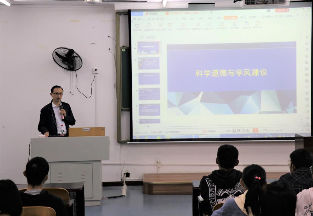 杨德刚副院长以“你认为你诚信吗?”这样一个问句作为开场,引发同学们的深思。他指出:近年来,学术不端行为滋长,违反科研伦理行为时有发生。随后,他从个人、班级、学校等小方面,以及国家、全世界的大层面出发,着重强调加强科学教育和学风建设的重要性,让同学们深刻认识到加强科学教育和学风建设是促进我国科技事业健康发展、加快建设人才强国的重要内容。