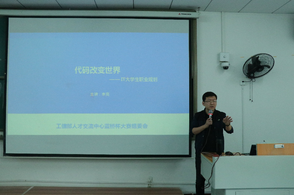 于2021年3月18日下午2点在励志楼2208教室,开展了由蓝桥杯大赛组委员会组织“代码改变世界——IT专业大学生职业生涯规划公益演讲”活动。我们非常荣幸地邀请到了蓝桥软件学院副院长李亮来此巡讲。
