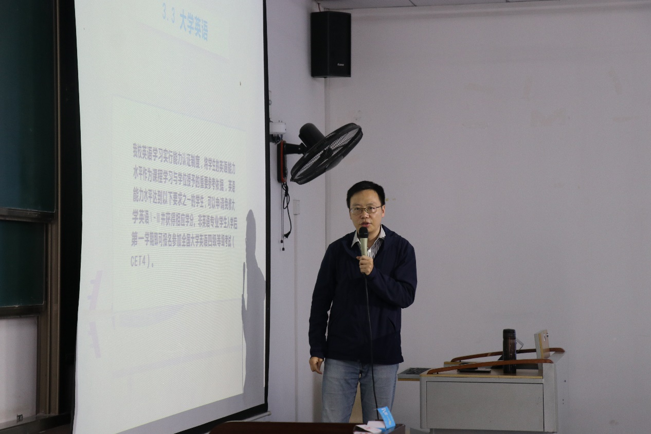 教学科研办公室主任——周扬博士主讲。宣讲伊始,周主任使用了驾车去目的地的生动例子比喻大学的学习之路。接着,便开始分4个部分讲解。
