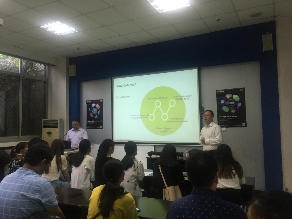 沙坪坝校区二教学楼2013教室开展了“德勤全球交付中心校园招聘会”。本次宣讲会由德勤DGC企业管理咨询部门负责人主讲,计信学院2018届毕业班辅导员姜扬参加了本次活动。