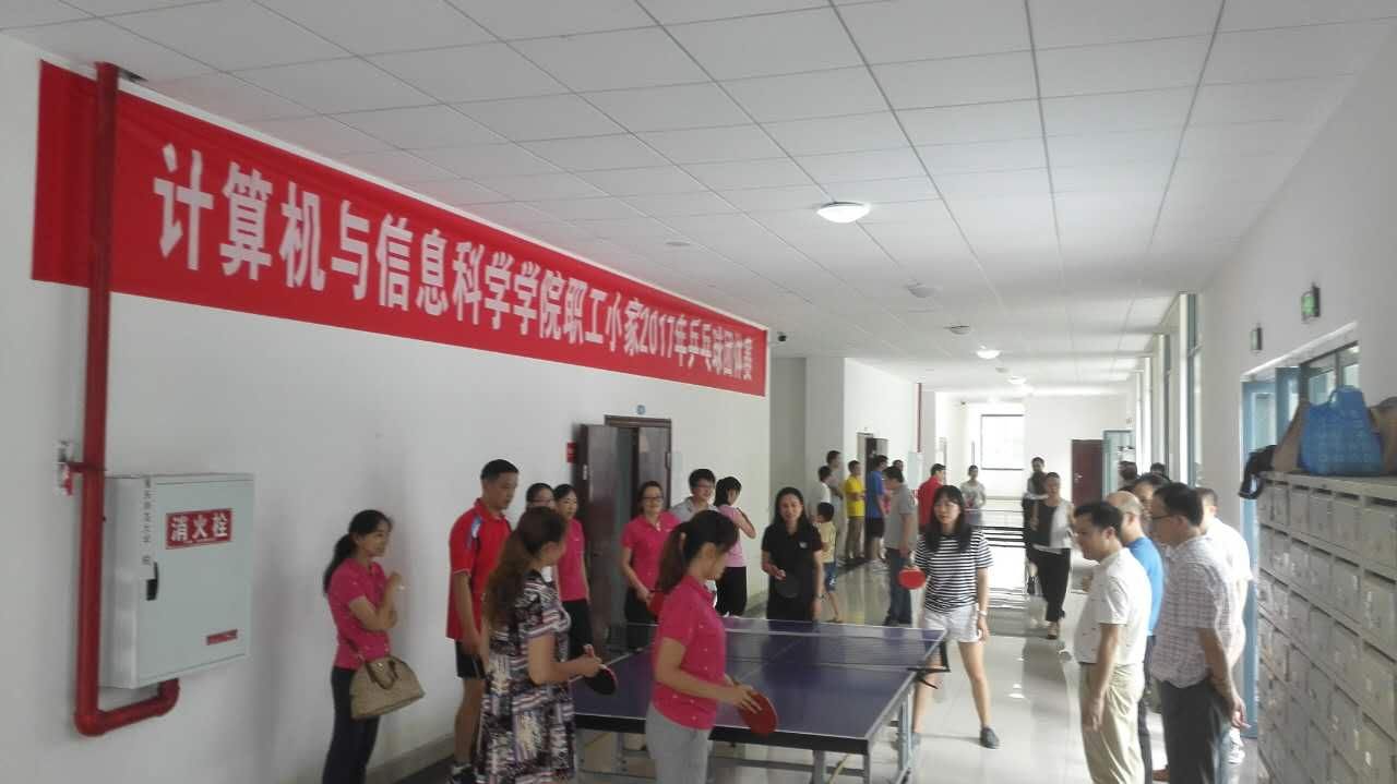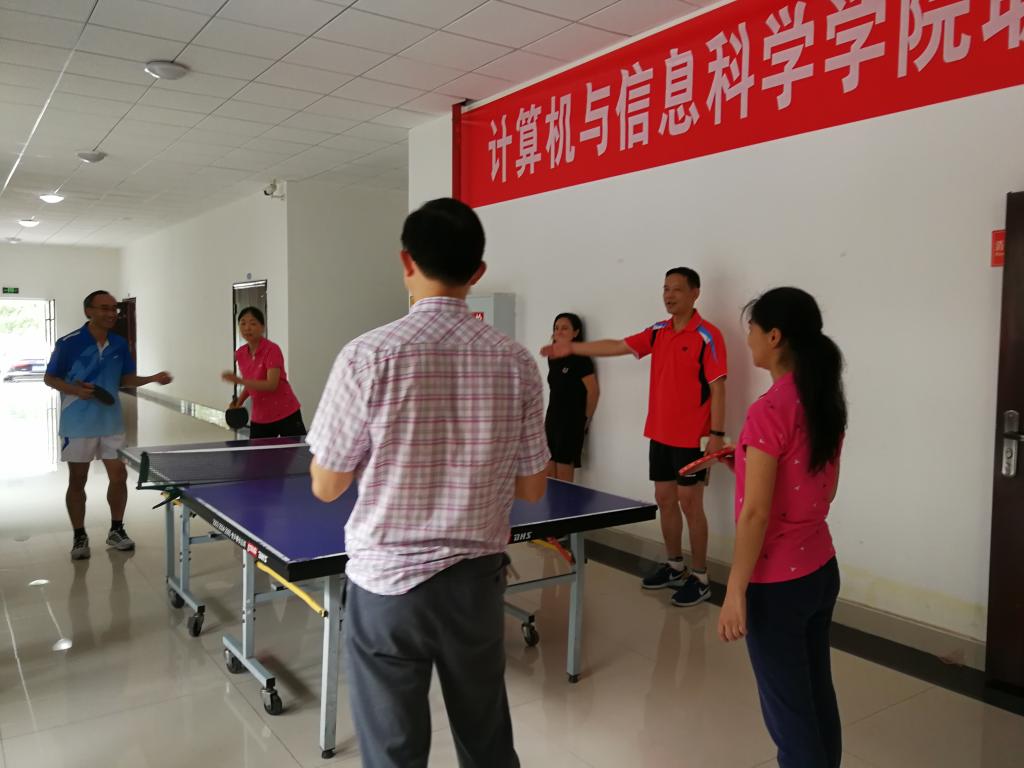6月30日下午2:30,汇贤楼一楼,学院工会组织一场别开生面的“乒乓球团体比赛”活动。活动以工会小组为单位,分别由计算机科学与技术系、软件工程系和实验中心、电子商务系和信息管理与信息系统系、计算机基础系和行政小组等单位组成,上场比赛队员达到30人,占全院教职工总数近50%,其他老师则成为本单位拉拉队队员。