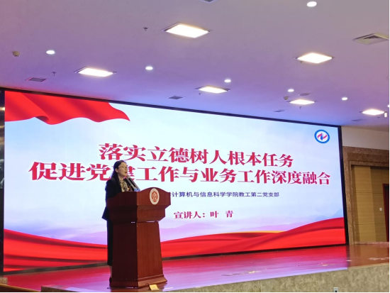 教工第二党支部书记叶青代表学院参赛,获得二等奖第一名的好成绩。她以“落实立德树人根本任务,促进党建工作与业务工作深度融合”为题进行理论宣讲。宣讲结合支部工作实际,阐释如何从机制融合、队伍融合、评价融合三方面拓展融合途径,从“党建+课程思政”“党建+科技创新”“党建+服务社会”三个维度创新融合模式,实现“一融双高”的新时代高校党建和事业融合发展思路。在答辩环节,针对案例准确地阐明了党费的使用规则和范围,得到评委的一致认可。本次大赛既是展示风采的舞台,更是互学互鉴的平台。赛事充分展现了我校党支部书记队伍“政治强、业务精、作风正”的优良素质,为推进基层党建高质量发展注入新动能。