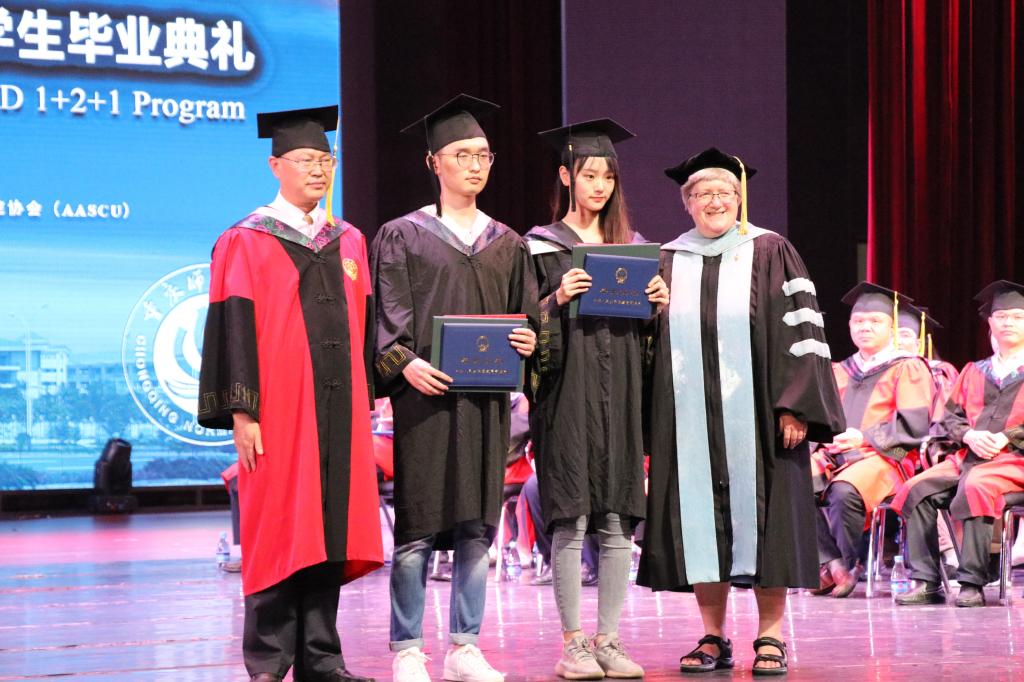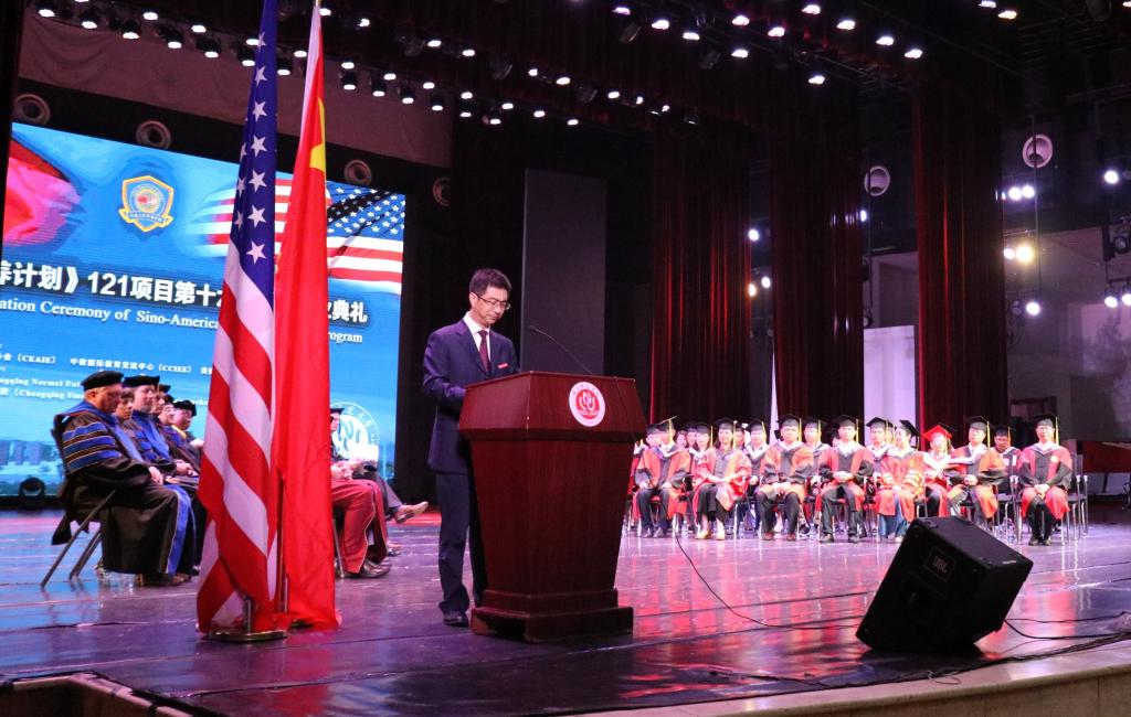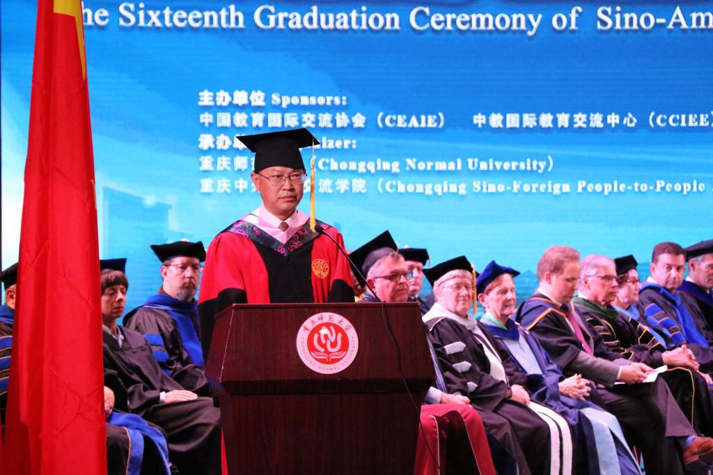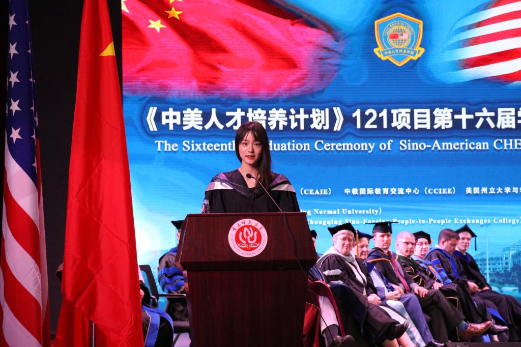 、重庆中外人文交流学院承办。出席典礼的有中国教育国际交流协会、中教国际教育交流中心、美国州立大学与学院协会和中美121项目高校的领导,以及毕业生的老师和同学,还有部分学生家长。